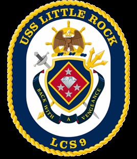 The coat of arms as blazoned in full color on a white oblong disc field within a dark blue designation band, edged with a gold roped border and bearing the name “USS LITTLE ROCK” at the top and “LCS 9” at the base.